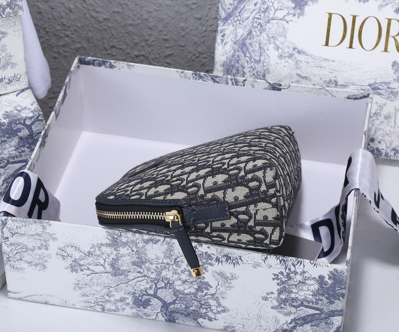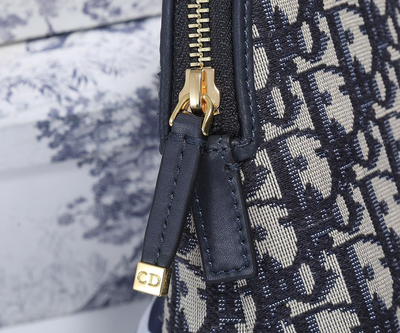 The 30 Montaigne beauty pouch is an elegant and timeless accessory. Crafted in blue jacquard, it features the House's hallmark Dior Oblique pattern. The design, with its 'CD' signature on the front, can hold all beauty essentials or other accessories. The beauty pouch may easily be slipped into a Dior Book Tote and can be paired with other 30 Montaigne creations.