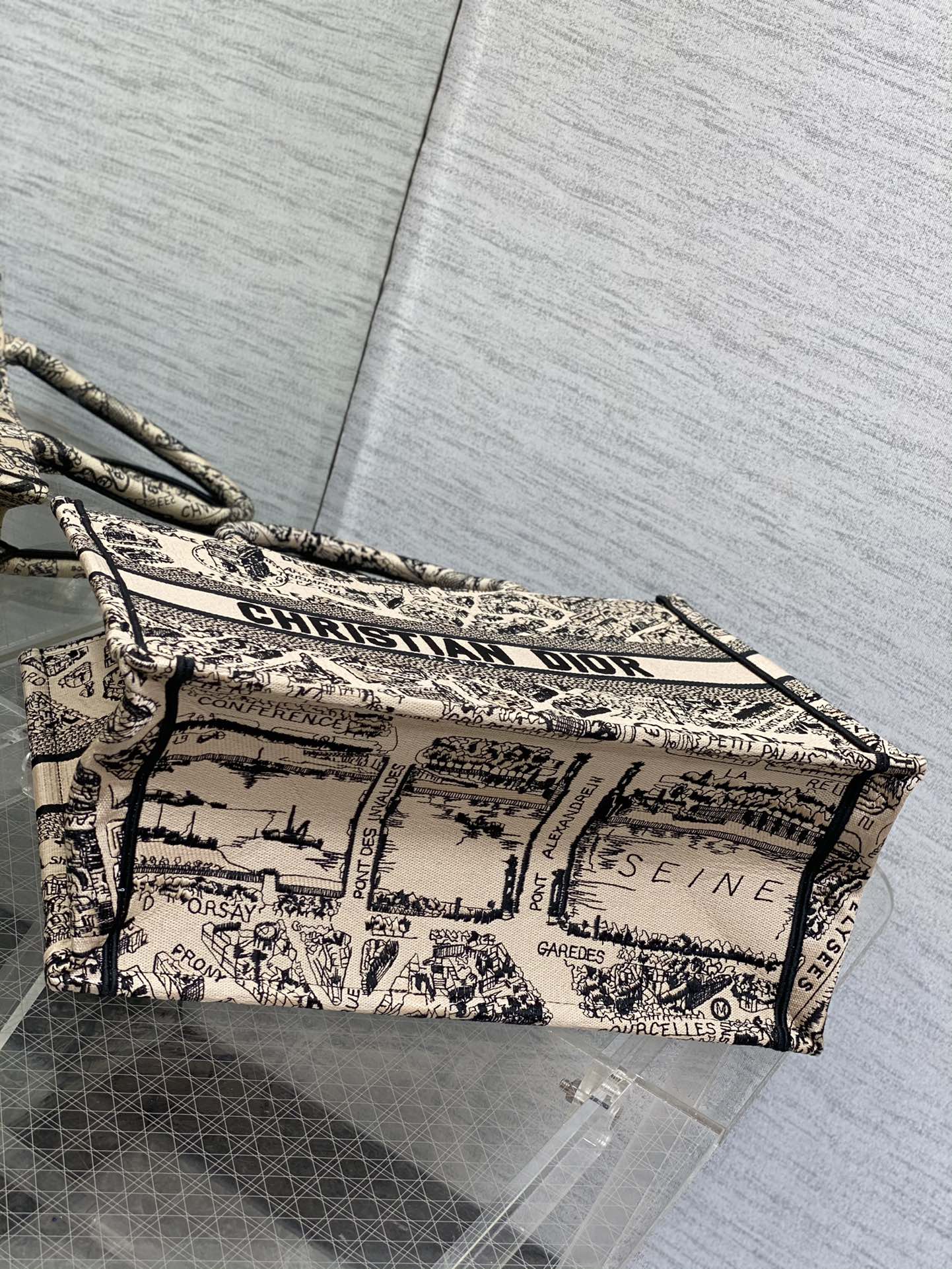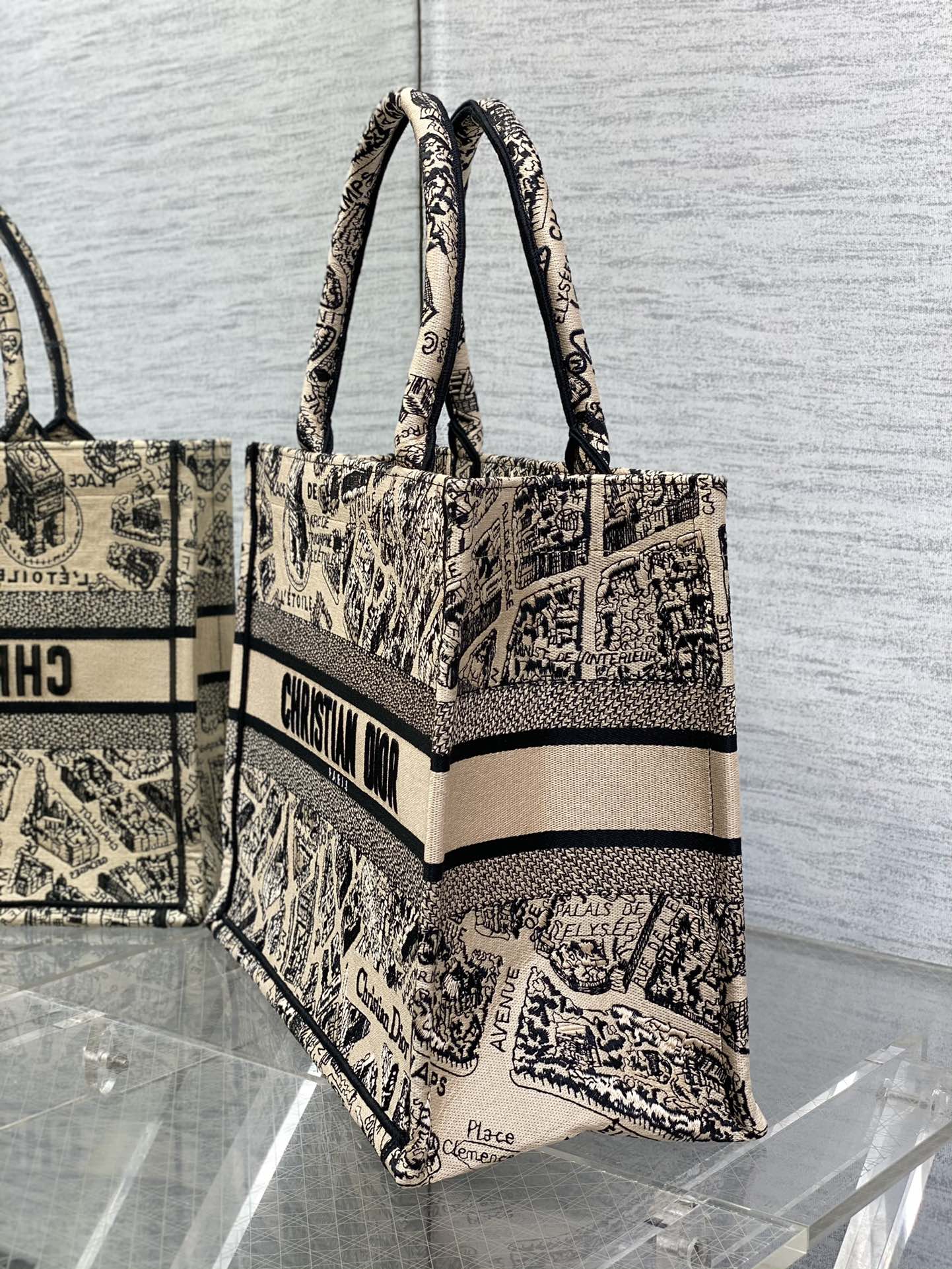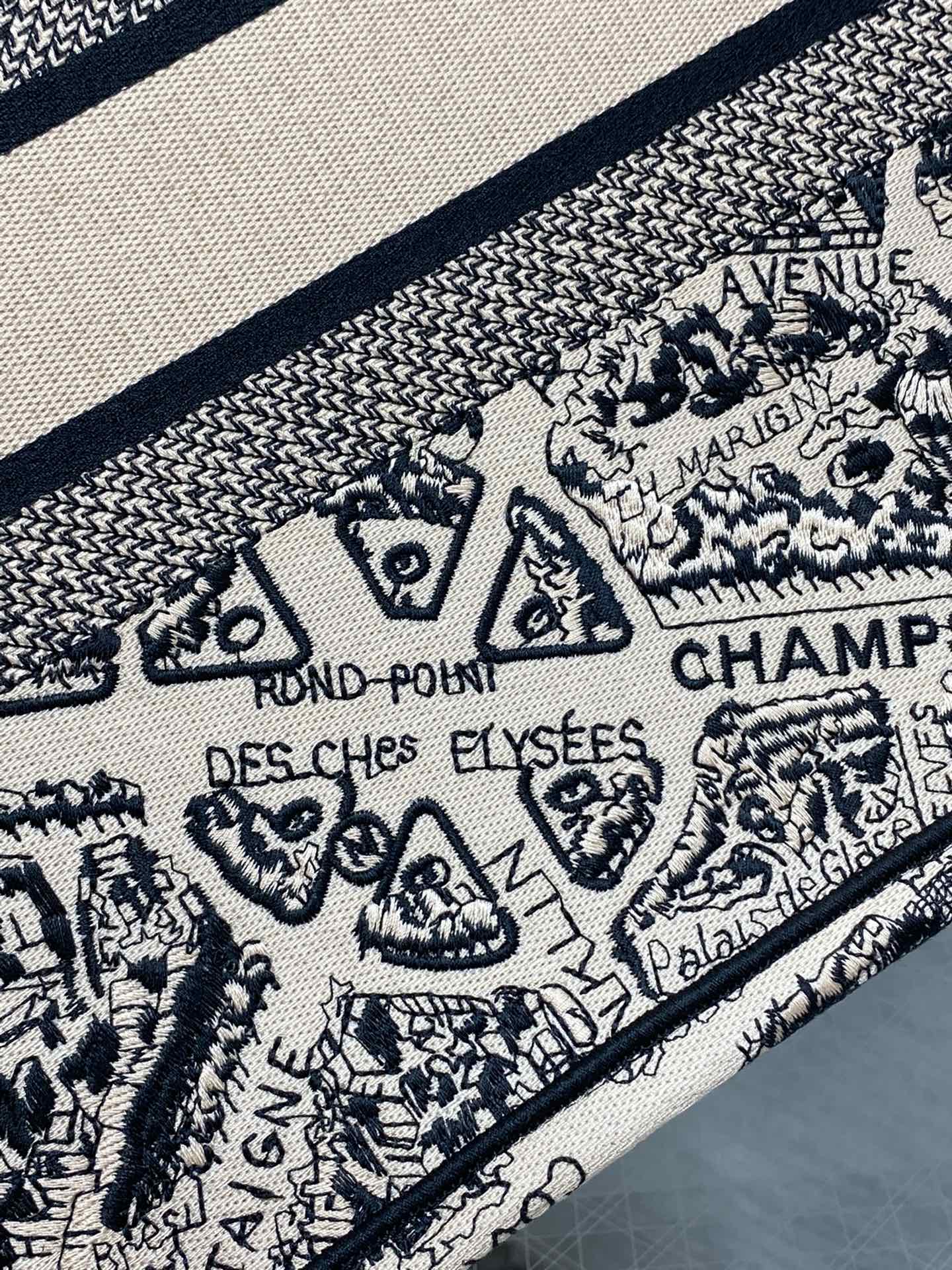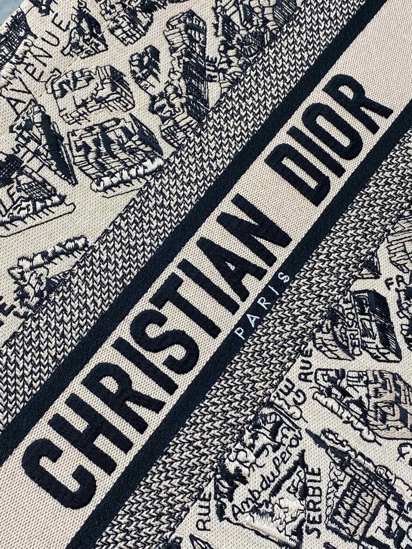 Introduced by Maria Grazia Chiuri, Creative Director of Christian Dior, the Dior Book Tote has become a staple of the Dior aesthetic. Designed to hold all the daily essentials, the black style is fully embroidered with a white Dior Around the World motif, further embellished with a play on shiny and matte thread. The design is adorned with the 'CHRISTIAN DIOR' signature on the front and exemplifies the House's signature savoir-faire. The tote may be carried by hand or worn over the shoulder.