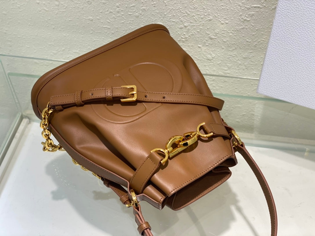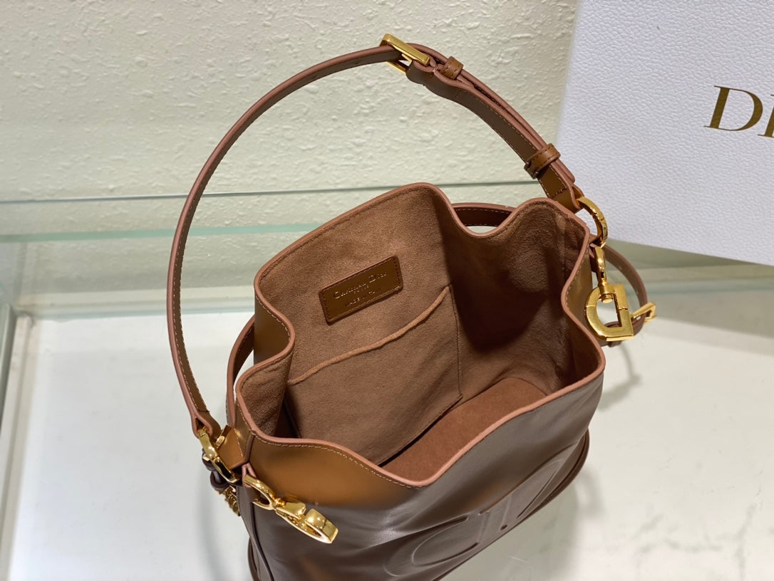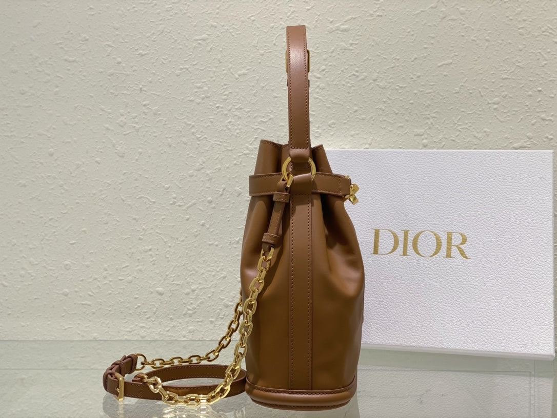 New for Fall 2023, the C'est Dior bag is an elegant and timeless creation. Crafted in golden saddle calfskin, it is distinguished by the embossed CD signature on the front in tribute to the House's savoir-faire. Thanks to its CD Lock closure with a twisting letter D, the bucket bag can keep the essentials secure. A top handle and adjustable, removable chain strap with a leather insert allow the medium bag to be comfortably carried by hand or worn over the shoulder.