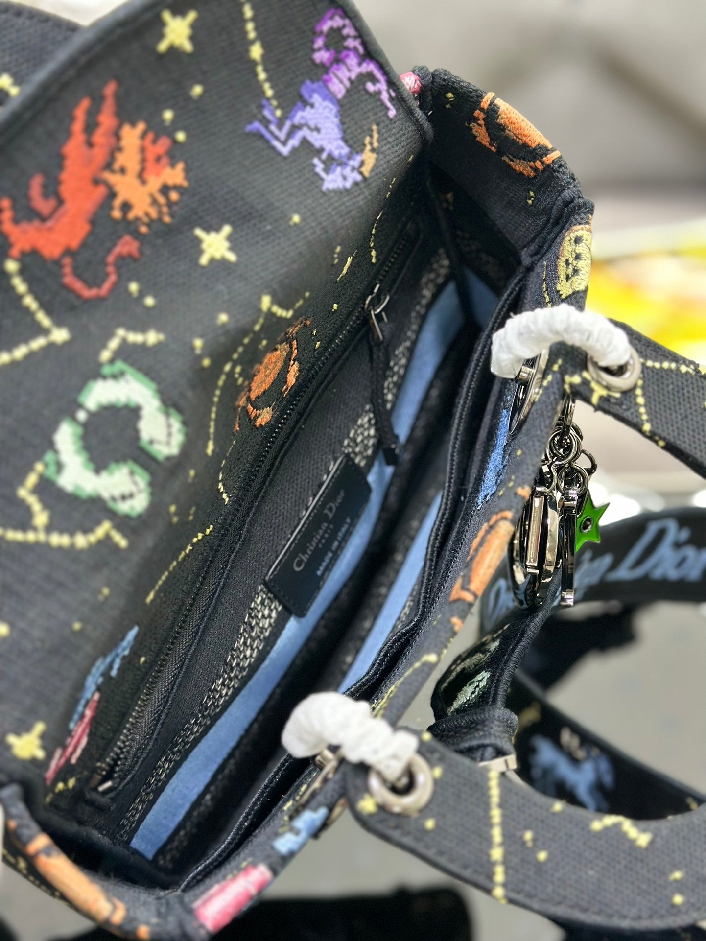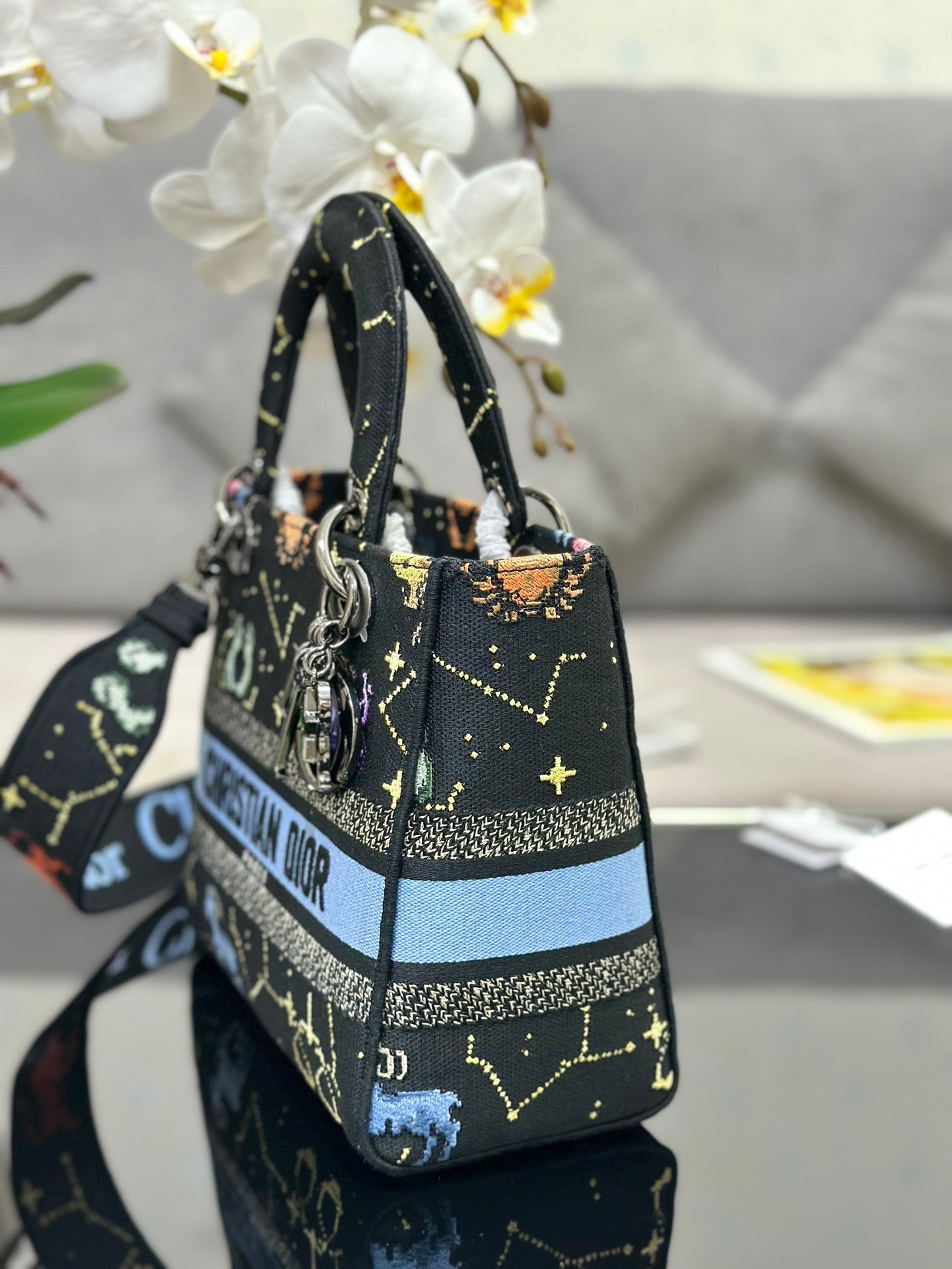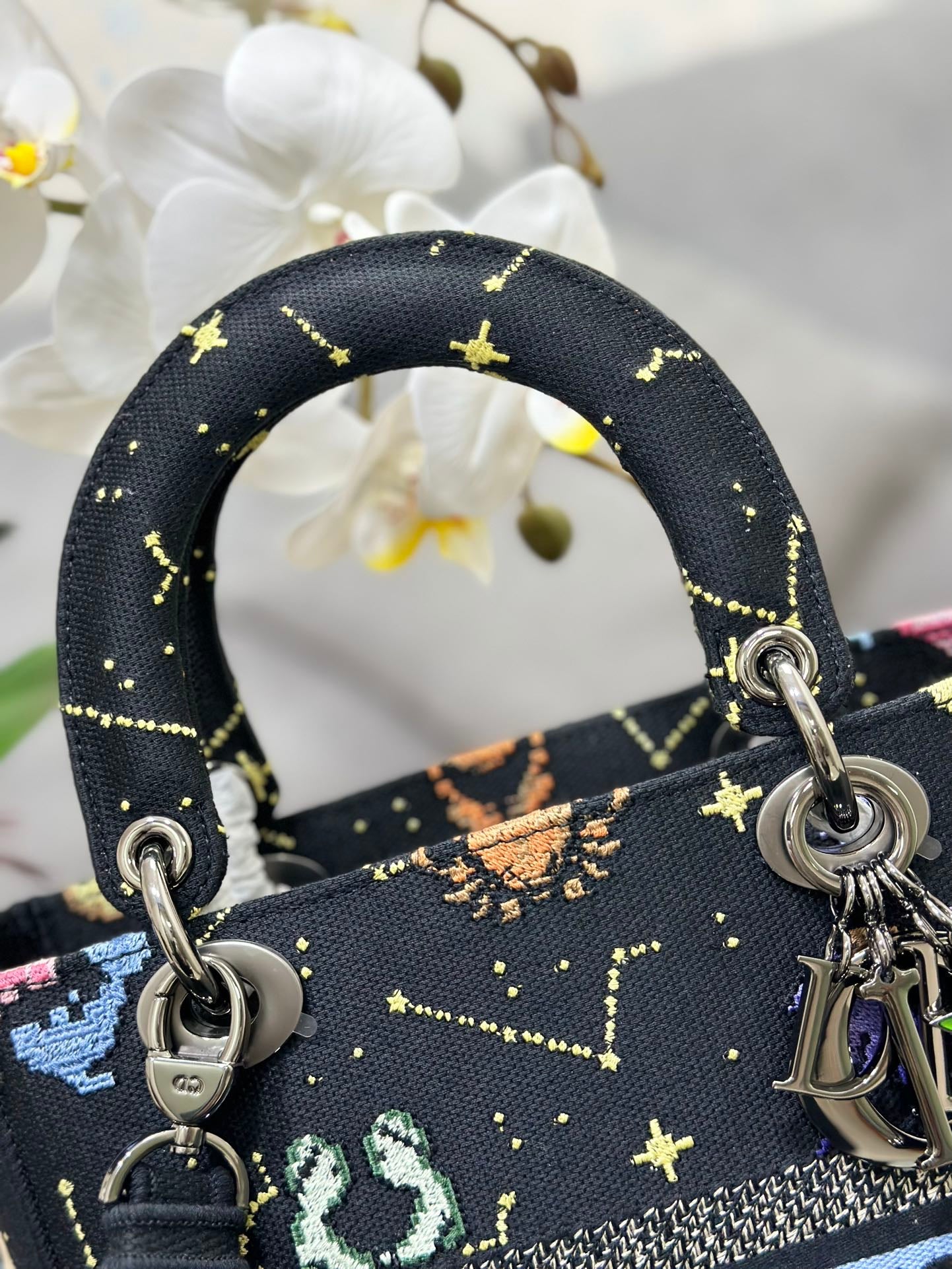 The Lady D-Lite bag combines classic elegance with House modernity. The style is fully embroidered with the Rose des Vents houndstooth motif, a play on the hallmark House pattern. The front features a 'CHRISTIAN DIOR' signature while the thick 'D.I.O.R.' charms in pale gold-finish metal embellish and illuminate the silhouette. Equipped with a wide, reversible and removable embroidered shoulder strap, the medium Lady D-Lite bag can be carried by hand, worn over the shoulder or crossbody.
