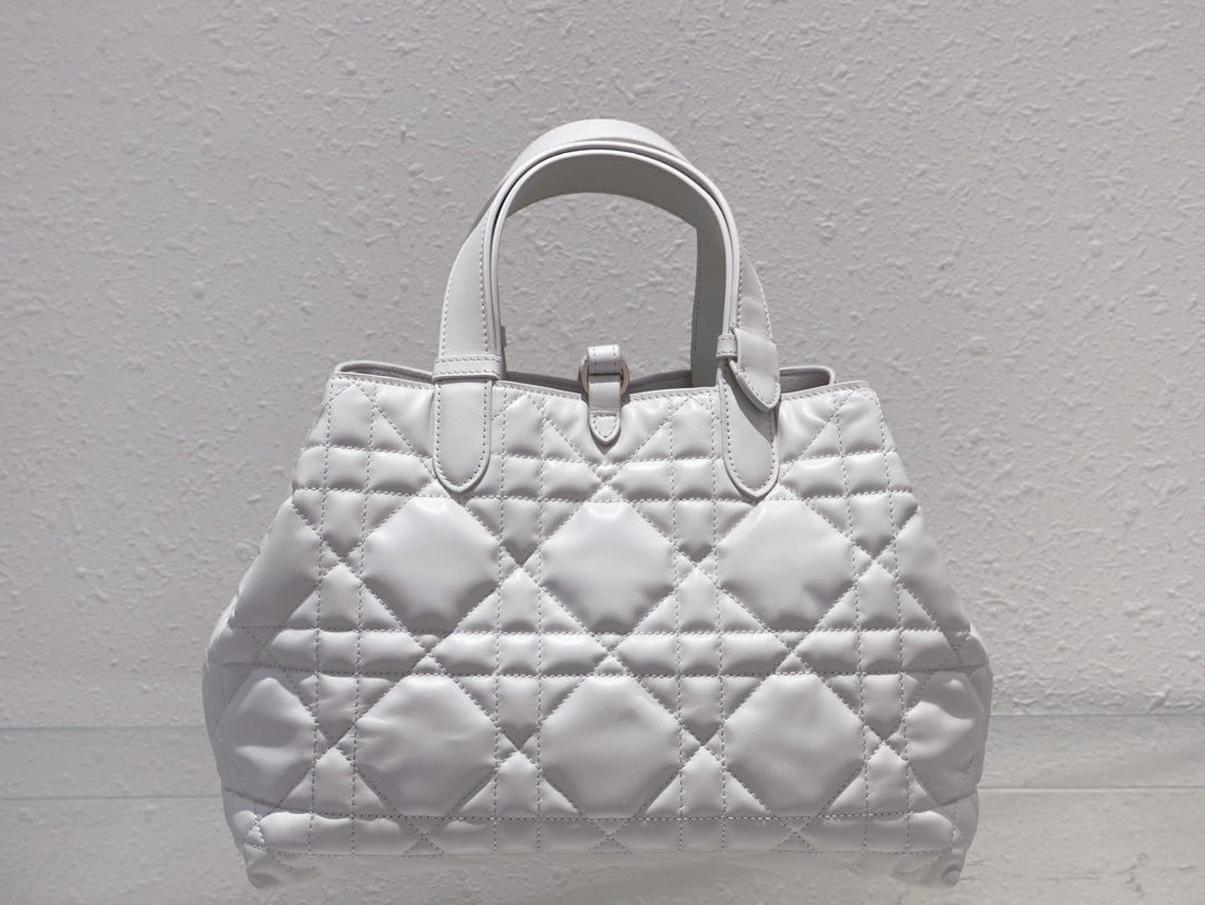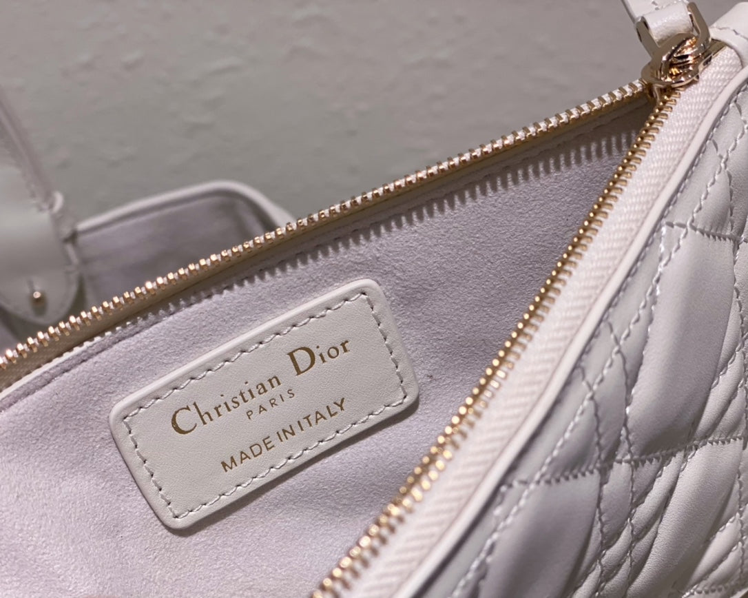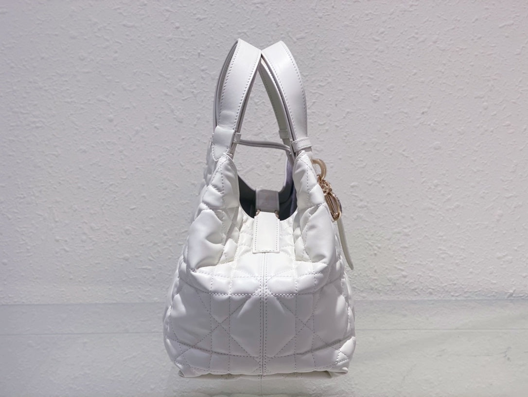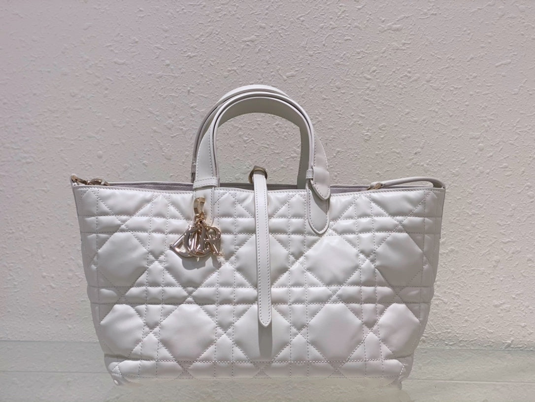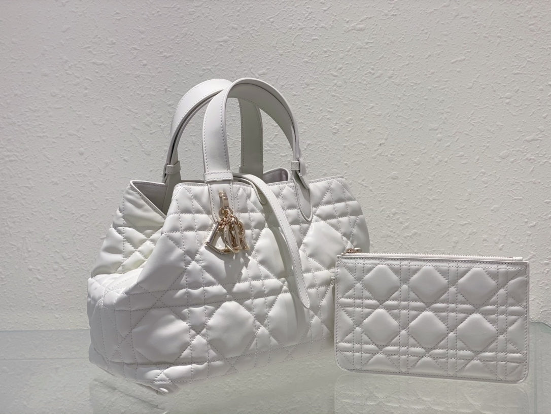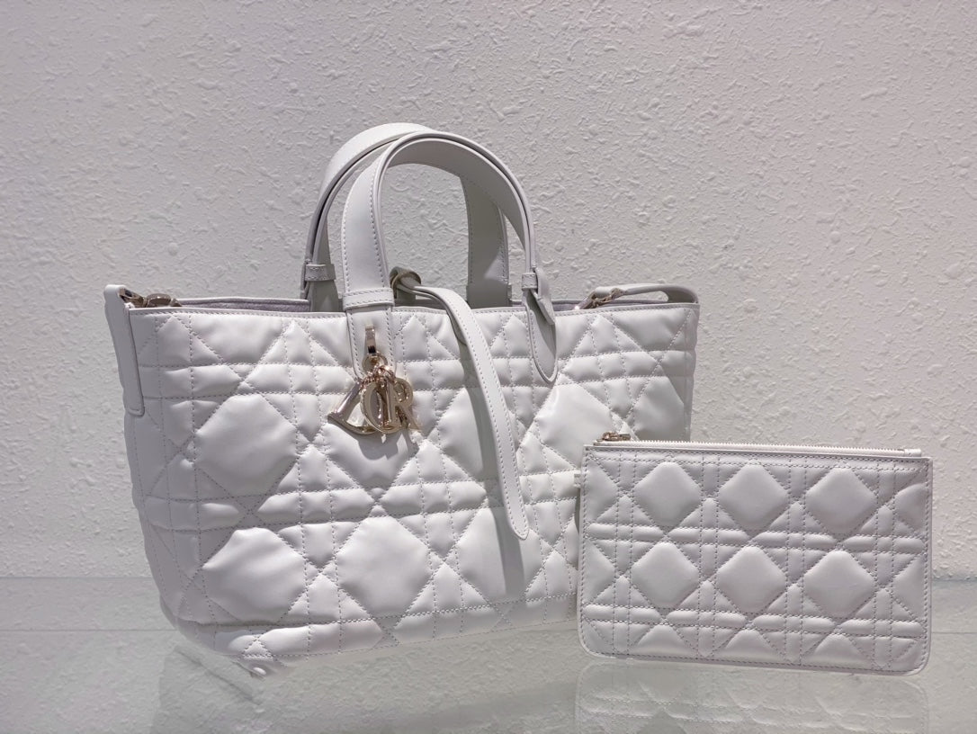 Unveiled at the Spring-Summer 2023 fashion show, the Dior Toujours bag is distinguished by a casual and practical design. Crafted in medium tan calfskin with Macrocannage topstitching, it showcases a spacious interior compartment with a matching pouch to organize essentials. Its leather strap closure keeps items secure while the D of the CD Lock closure twists to adjust the sides and enhance the bag's silhouette. The leather handles can be adjusted using the small notches in order to be able to carry the medium bag by hand or wear it over the shoulder.