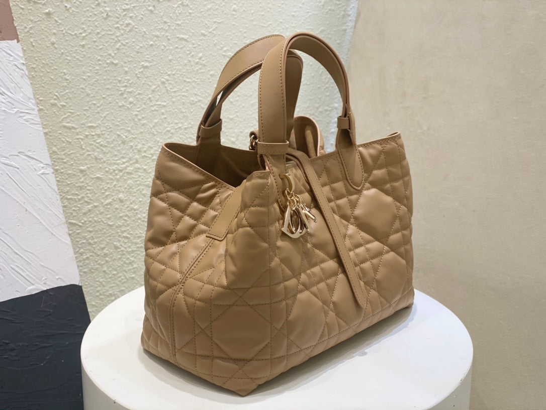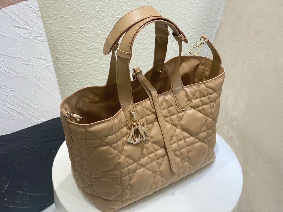 Unveiled at the Spring-Summer 2023 fashion show, the Dior Toujours bag is distinguished by a casual and practical design. Crafted in medium tan calfskin with Macrocannage topstitching, it showcases a spacious interior compartment with a matching pouch to organize essentials. Its leather strap closure keeps items secure while the D of the CD Lock closure twists to adjust the sides and enhance the bag's silhouette. The leather handles can be adjusted using the small notches in order to be able to carry the medium bag by hand or wear it over the shoulder.