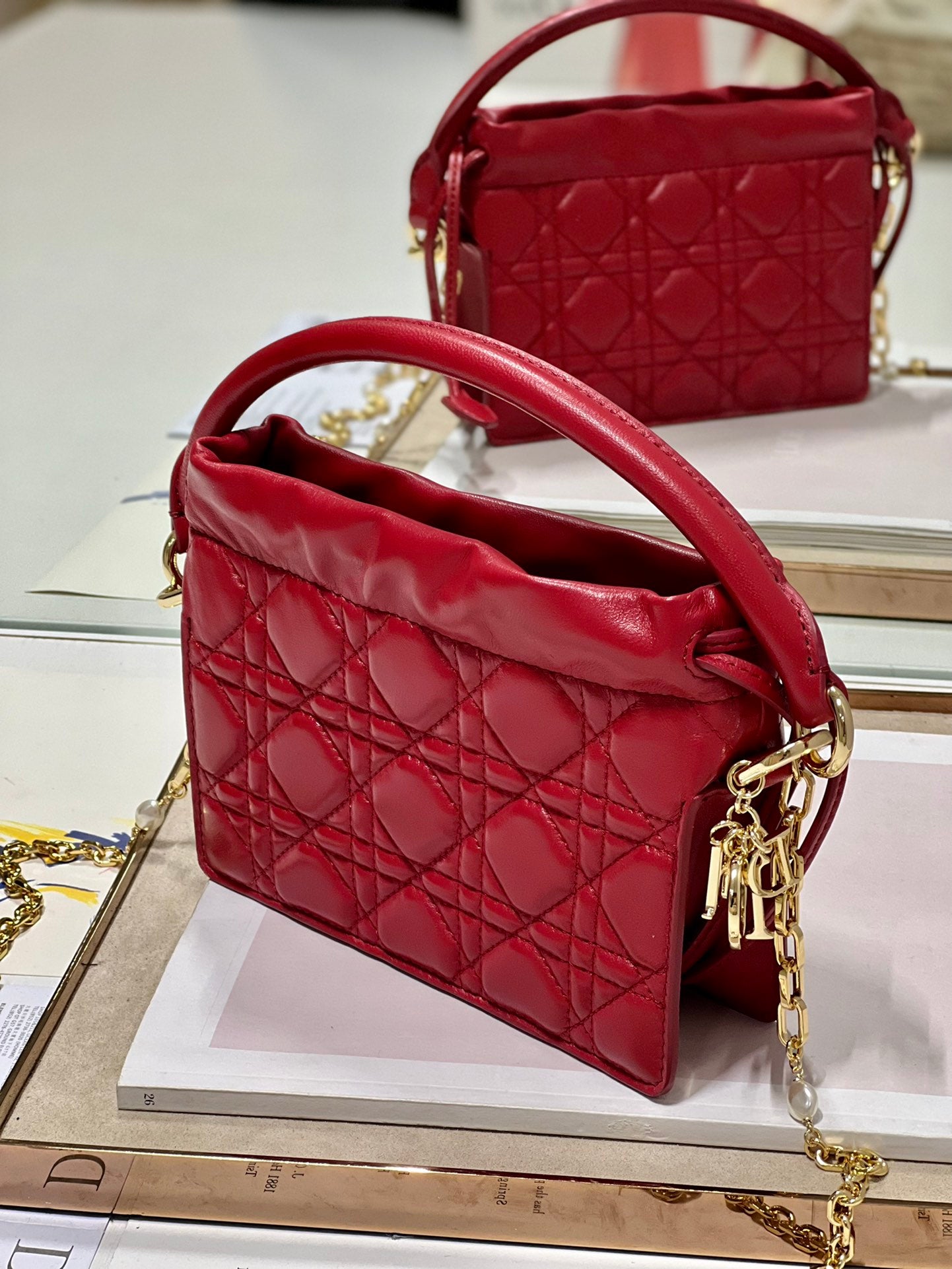 New for Spring 2023, the sophisticated, retro-style Milly bag elevates the Lady Dior line. Crafted in black Cannage lambskin, it features a D.I.O.R. charm and a drawstring cord closure. The removable leather handle is completed by a detachable chain punctuated with beads, allowing the miniature bag to be carried by hand or worn crossbody.