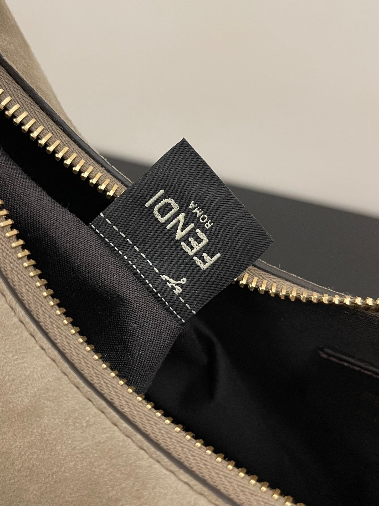 Small hobo bag made of beige suede, with vintage gold metal FENDI lettering visible when the bag is worn under the arm.