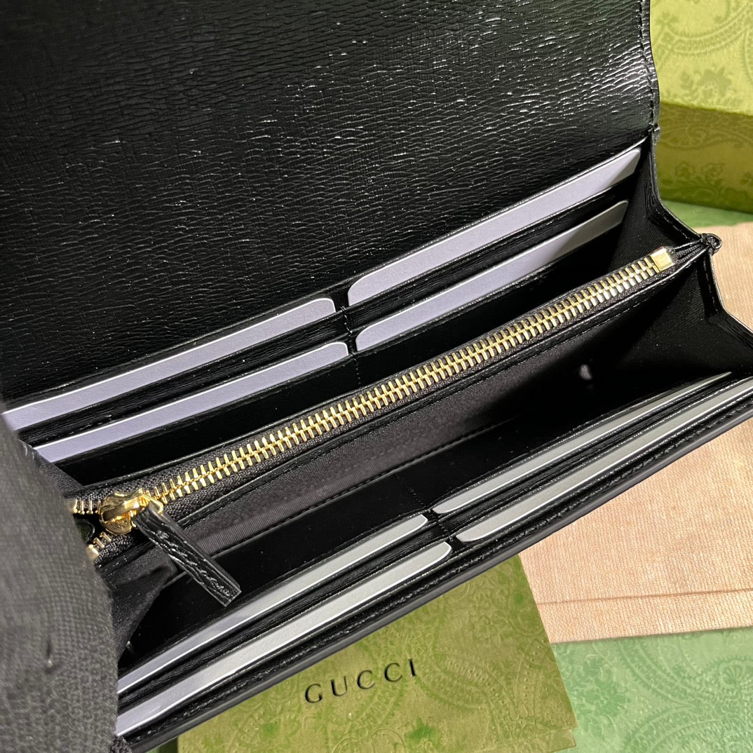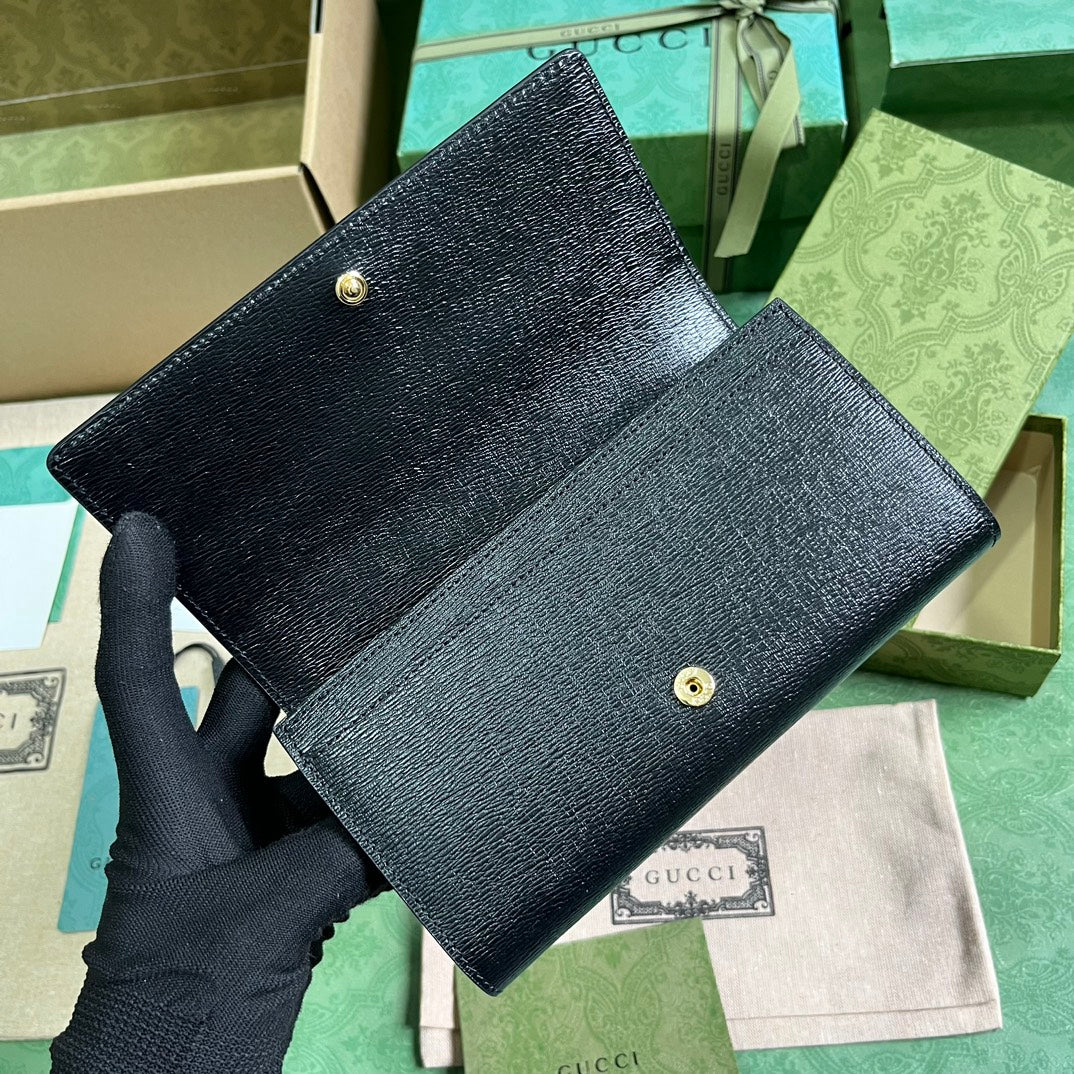 Imbued with archival inspired references, small accessories evolve for the latest collections. Presented in black leather, the continental wallet is completed by a gold-toned Gucci script detail. The signature design features twelve card slots as well as a zip coin pocket and snap button closure.