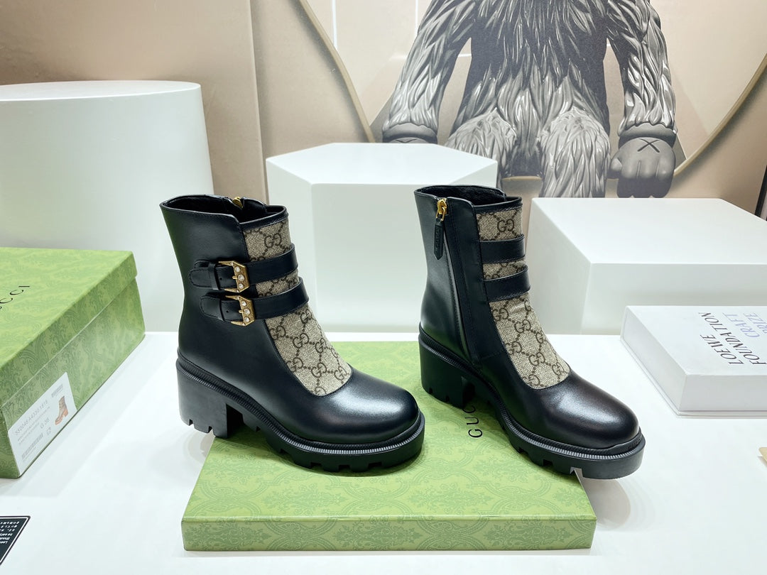 Sparkling crystals elevate this pair of ankle boots, elevating the classic hardware to become a signature design detail. The style is presented in a mix of black leather with monogram canvas.