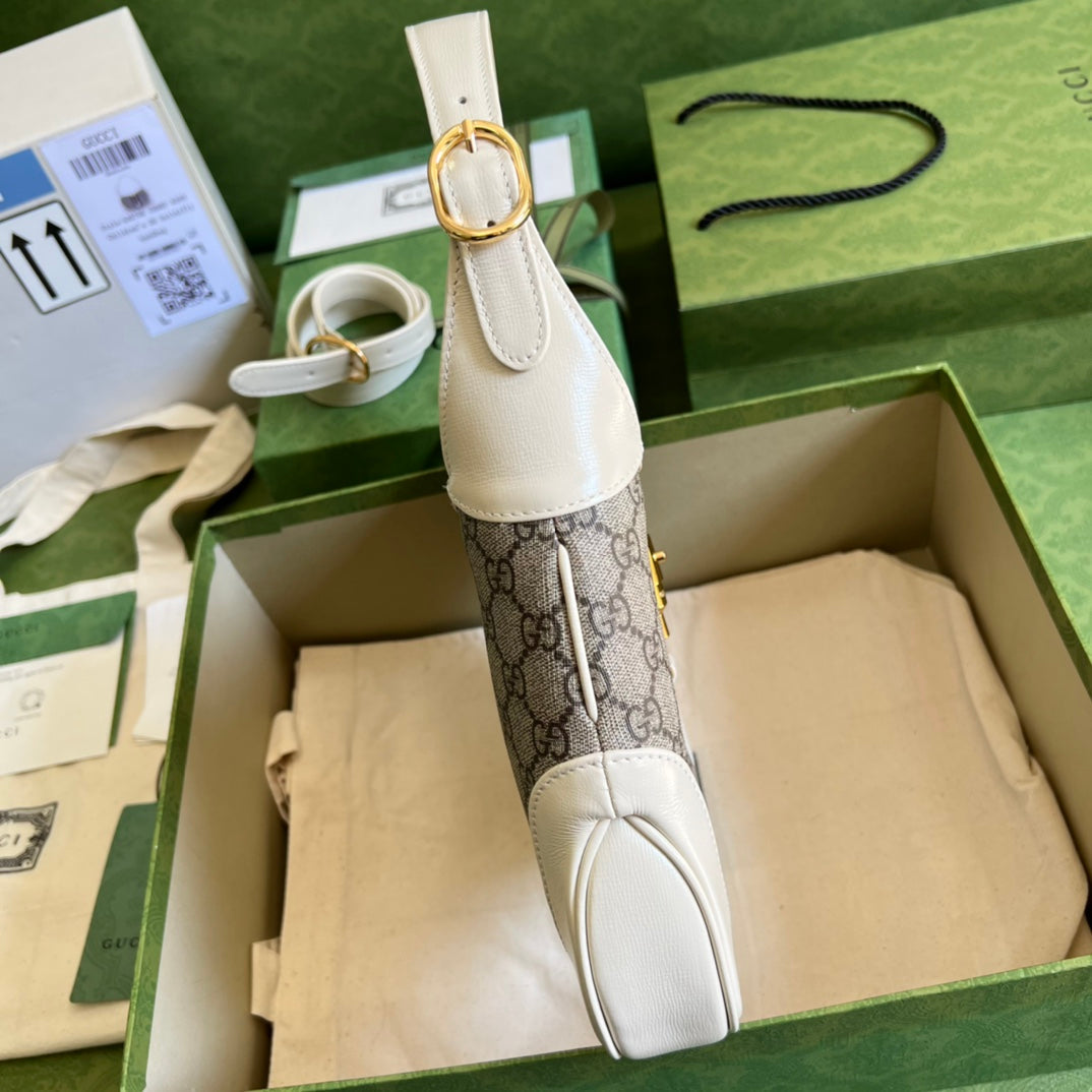 historic design, the Jackie 1961 is reimagined in denim. A message about leaving fashion’s old rules behind, the House's designs convey the idea that pieces should be timeless–not just in fashion for one season. Speaking to this theme, the emblematic style is linked to the Gucci's rich history by the Web stripe and monogram motif.