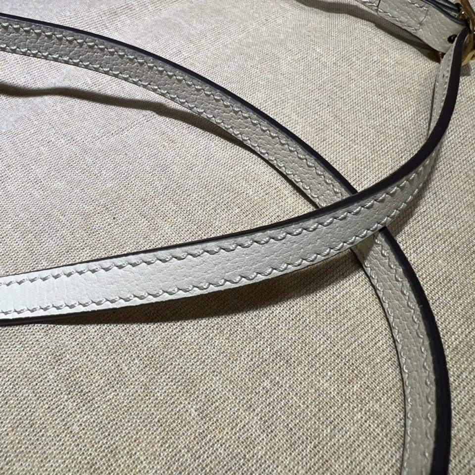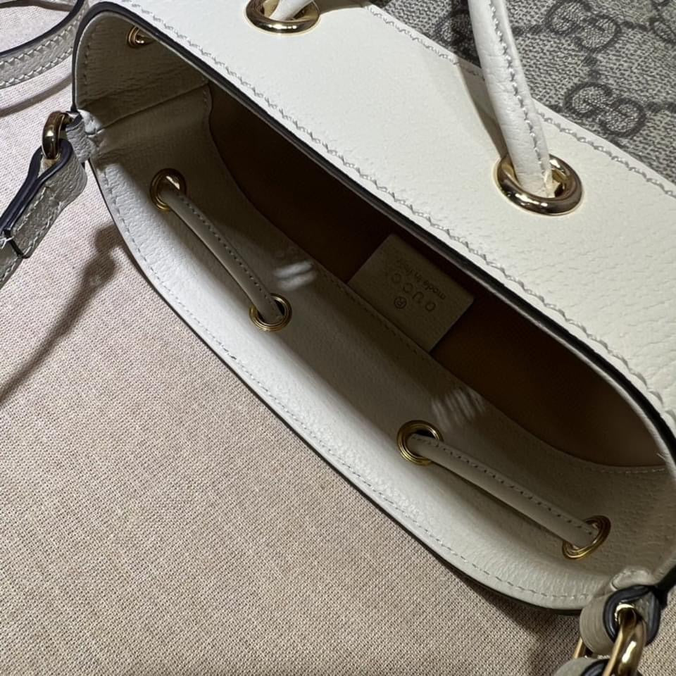 Within Gucci Aria the world of Ophidia evolves with new iterations, combining vintage inspired details with emblematic House codes. This mini bucket bag is crafted from beige and ebony GG Supreme Canvas, with a distinctive white leather trim. The inlaid blue and red Web stripe completes the style, a homage to Gucci's equestrian heritage.