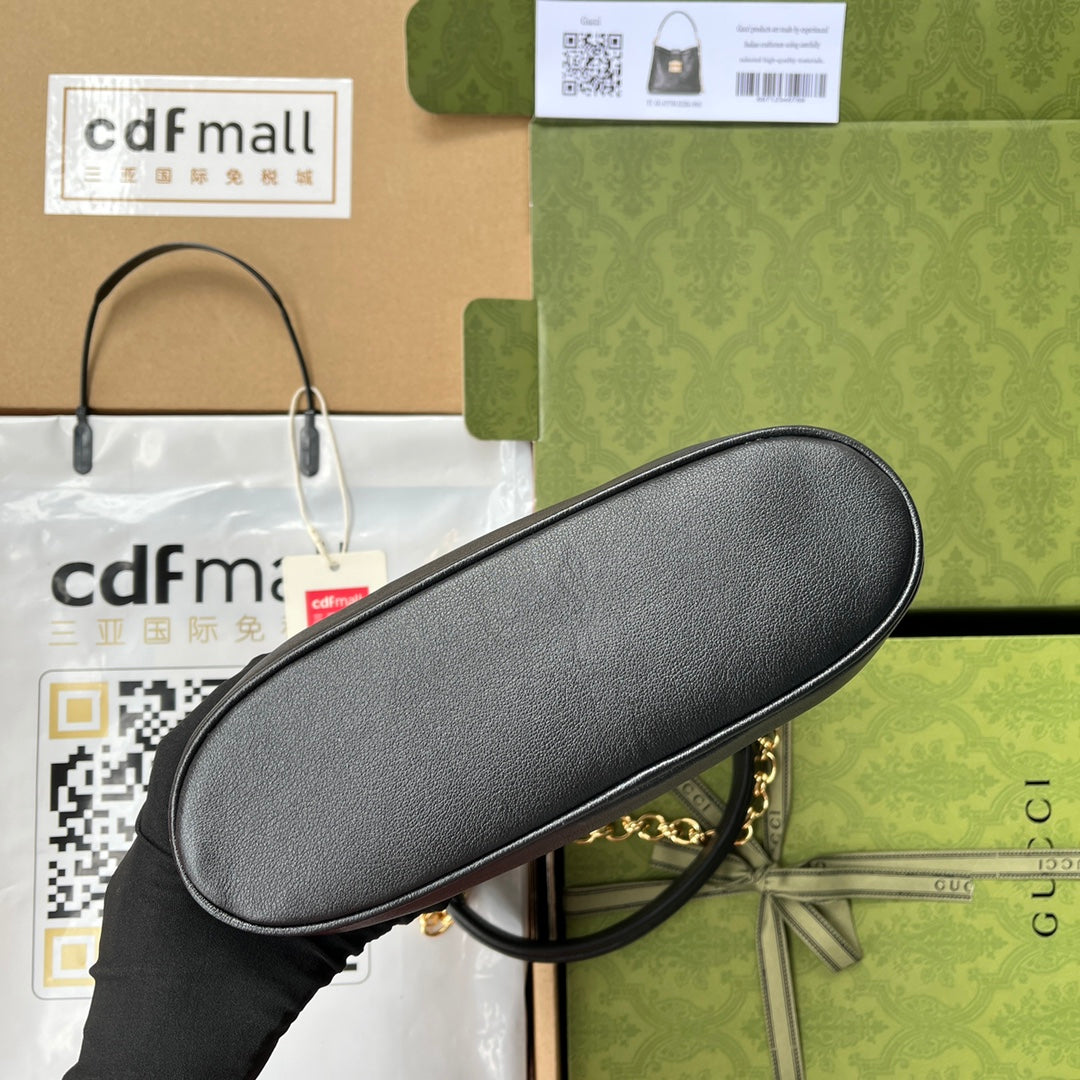 Enriched by decades worth of history, the GG motif evolves into new iterations each season. The symbol is a reference to not only the initials of the Founder of the House but also a subtle nod to the original Gucci Rhombi motif from the '30s. By bringing together different eras of Gucci's heritage, the pattern can be seen as an ever evolving tribute to the brand's origins. Here the monogram decorates a small shoulder bag in black.