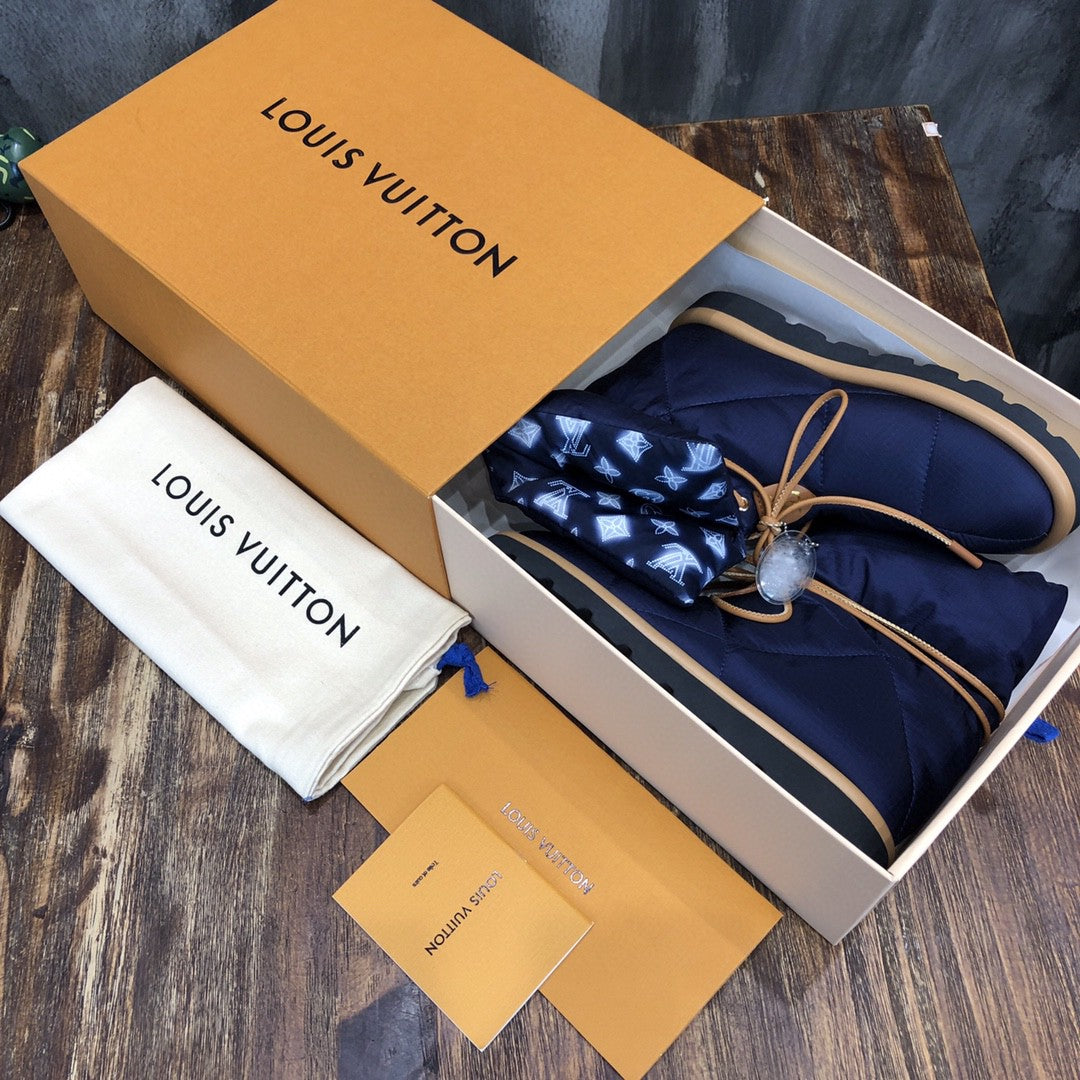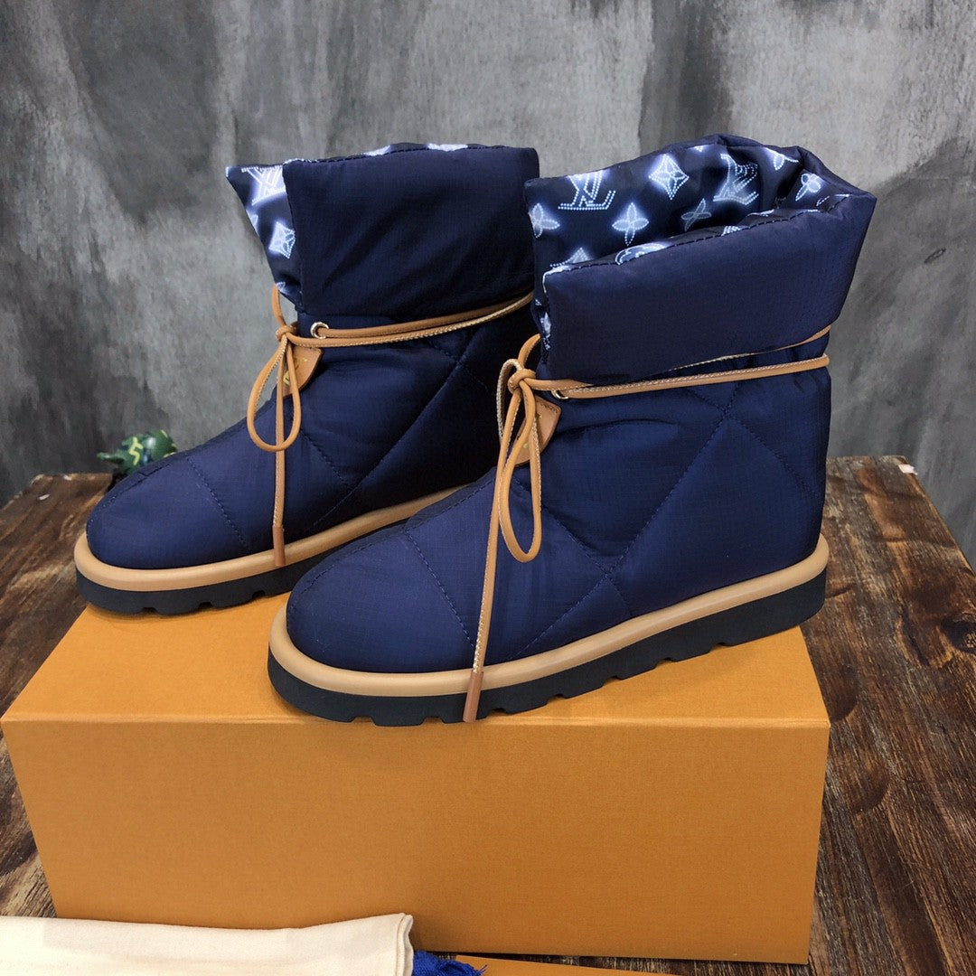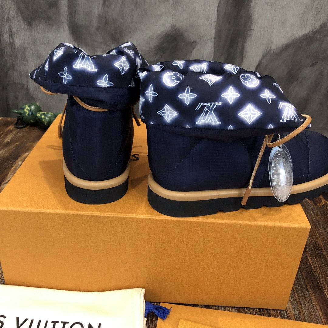 A cold-weather essential, the Pillow comfort ankle boot comes in water-repellent nylon with a warm down filling. The upper has a refined quilted finish, while the lining features the iconic Monogram pattern Its "sock like" inner layer in mesh textile ensures a perfect hold of the feet while offering comfort. Designed by Louis Vuitton Artistic Director Nicolas Ghesquière, this model is finished with a lightweight micro outsole with a contour in nappa leather, and can be worn outdoors as well as indoors.
