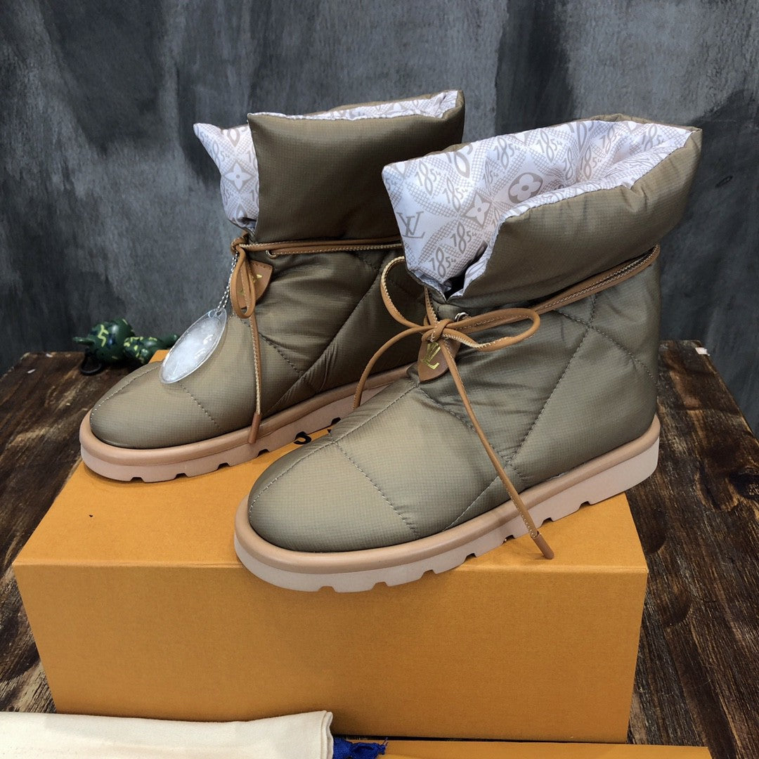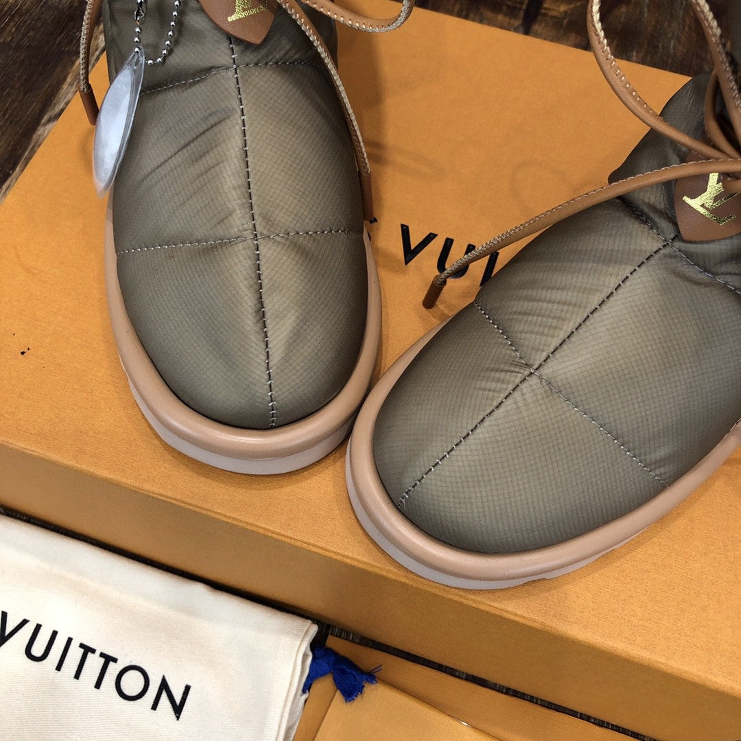 A cold-weather essential, the Pillow comfort ankle boot comes in water-repellent nylon with a warm down filling. The upper has a refined quilted finish, while the lining features the iconic Monogram pattern Its "sock like" inner layer in mesh textile ensures a perfect hold of the feet while offering comfort. Designed by Louis Vuitton Artistic Director Nicolas Ghesquière, this model is finished with a lightweight micro outsole with a contour in nappa leather, and can be worn outdoors as well as indoors.