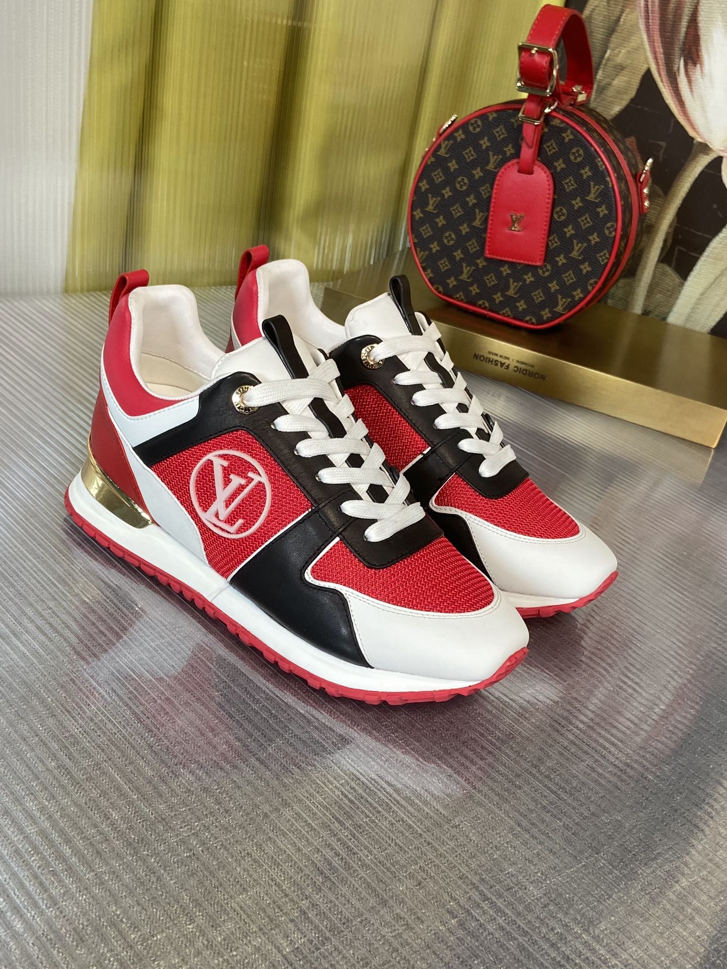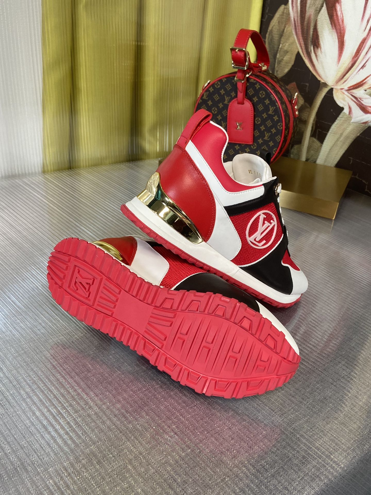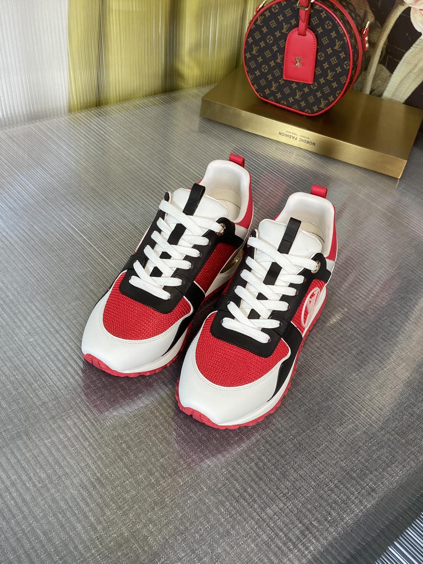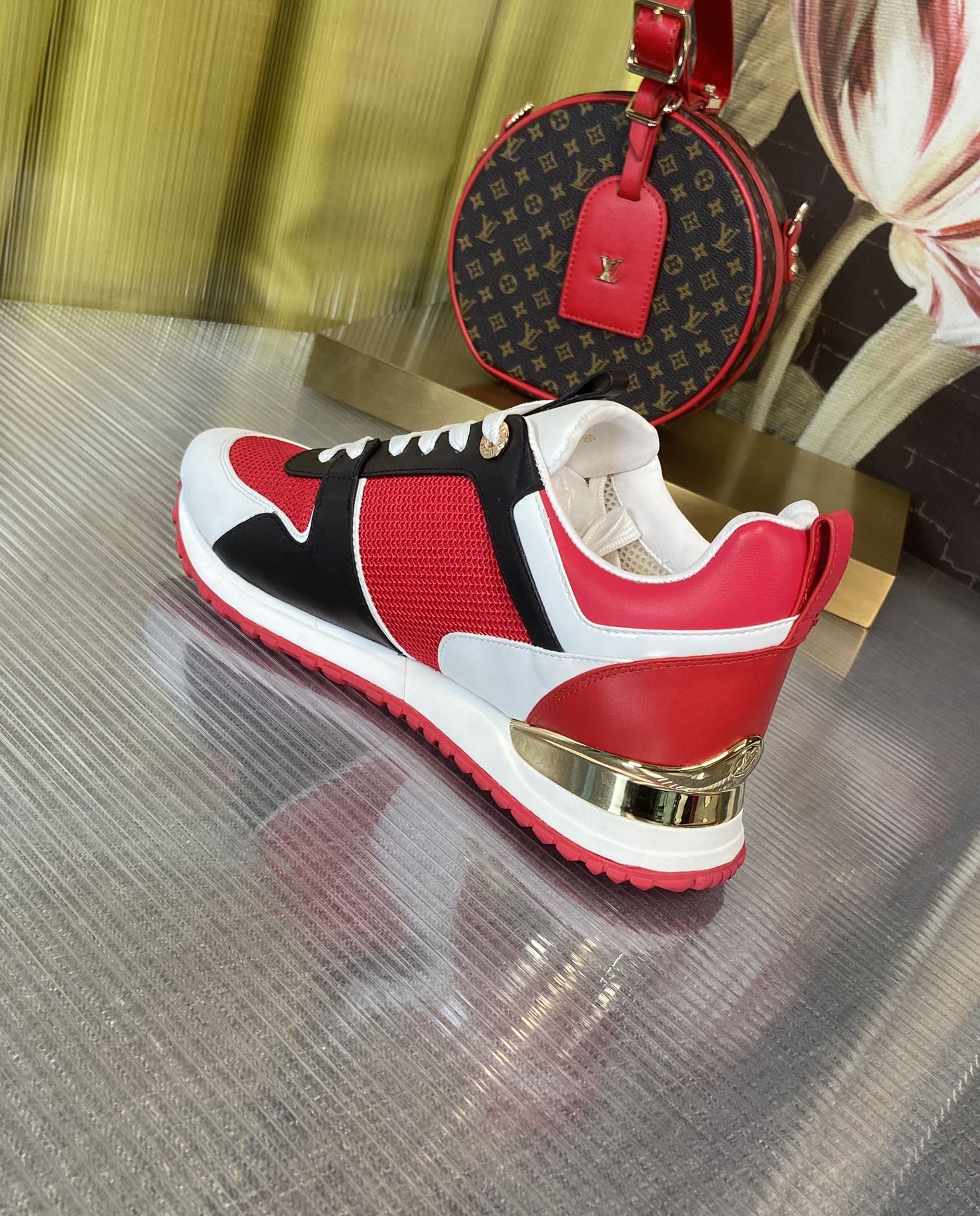 The Run Away sneaker is revisited in a slip-on version in a mix of materials, including calf leather, neoprene stretch textile and technical mesh. On the side, an oversized LV Circle signature stands out in white on the black background. This model is characterized by its hidden wedge construction, which discreetly adds extra height.