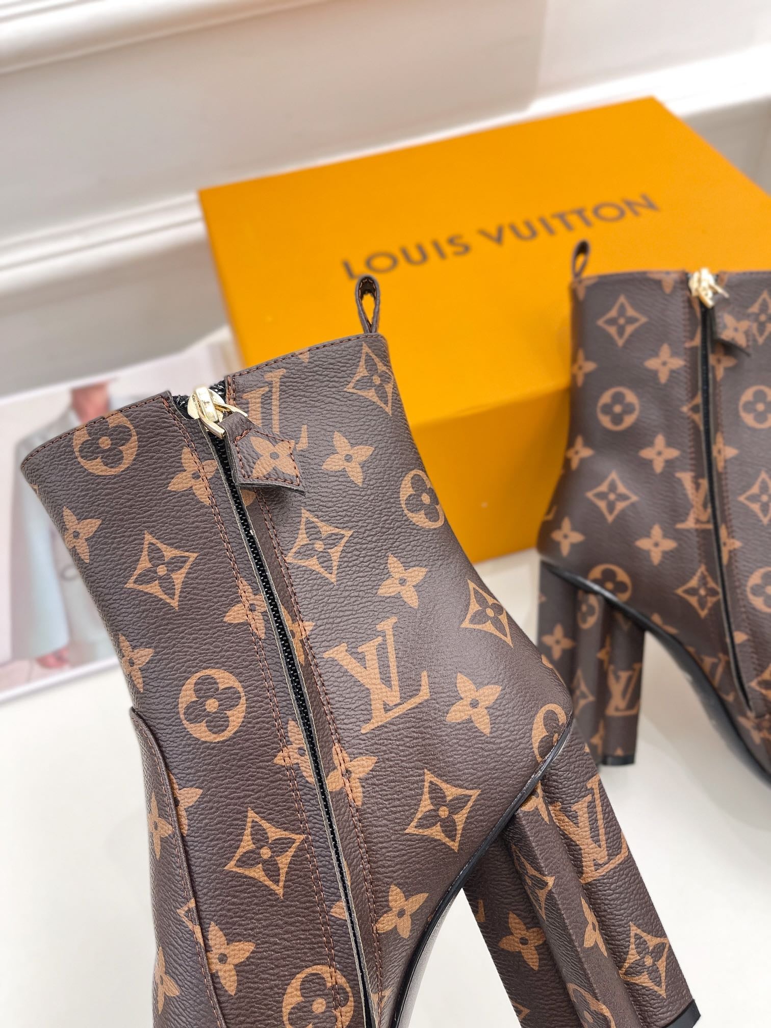 This elegant reinterpretation of the Silhouette ankle boot comes in smooth calf leather with a glazed calf-leather strap, which is decorated with gold-tone Monogram studs. The Monogram Flower-shaped heel, the key detail of the Silhouette line, has a glossy, lacquered finish for an all-black look. A back loop in Monogram canvas completes this design.