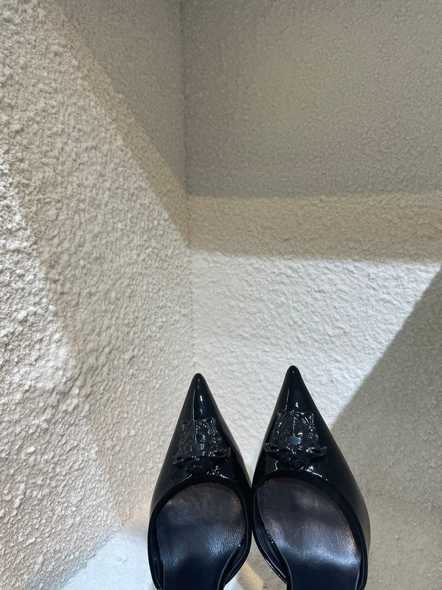 Crafted in supple calf leather, these sophisticated slingbacks elevate looks from the AM to PM. The sleek pointed toe silhouette is adorned with a Medusa plaque – the same décor found on the doors of the brand's first headquarters in Milan.