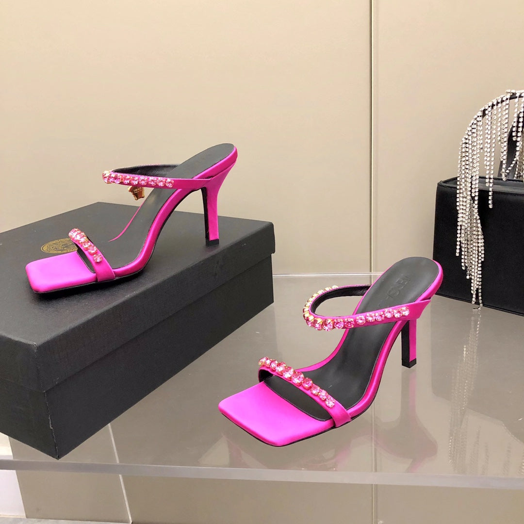 An elegant finishing touch to evening looks, these satin mules are enriched with a Medusa charm and rhinestones on the slim straps