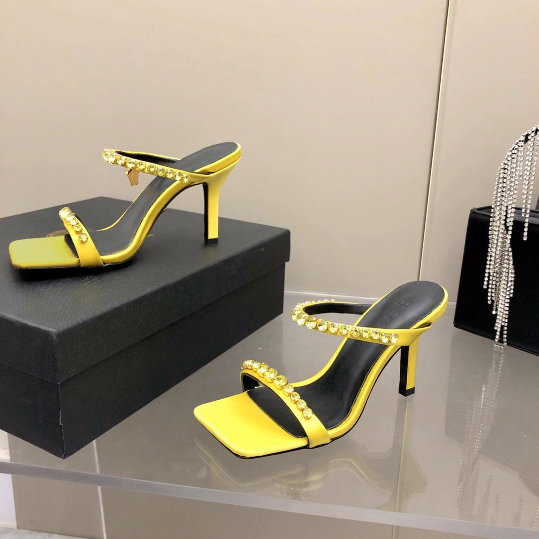 An elegant finishing touch to evening looks, these satin mules are enriched with a Medusa charm and rhinestones on the slim straps